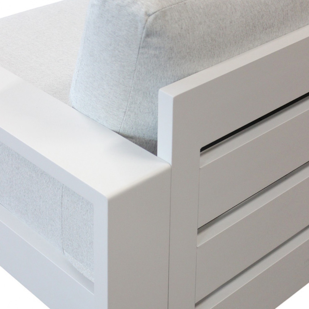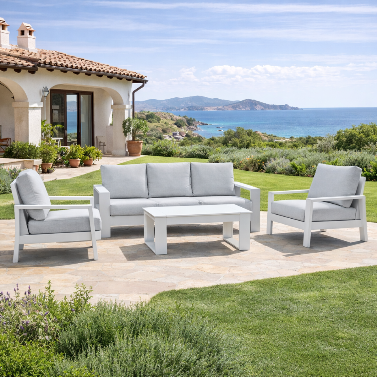 Il Salotto da giardino Boa Vista 3 posti con struttura in colore Bianco e cuscini Grigi è una soluzione elegante e contemporanea, ideale per arredare con stile giardini, terrazze e spazi outdoor. Il contrasto raffinato tra la struttura chiara e la cuscineria grigia dona al set un aspetto moderno e luminoso, perfetto per ambienti esterni di design.