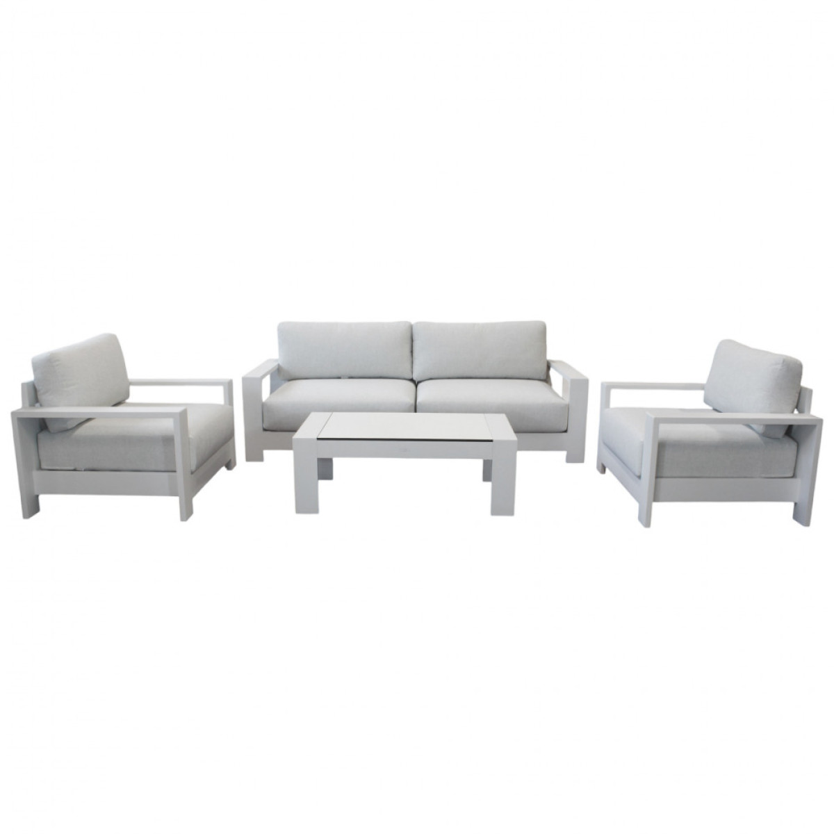 Il set è composto da un divano 3 posti, due poltrone con braccioli e un tavolino da caffè, offrendo una seduta confortevole fino a 5 persone e creando un’area relax completa e accogliente.