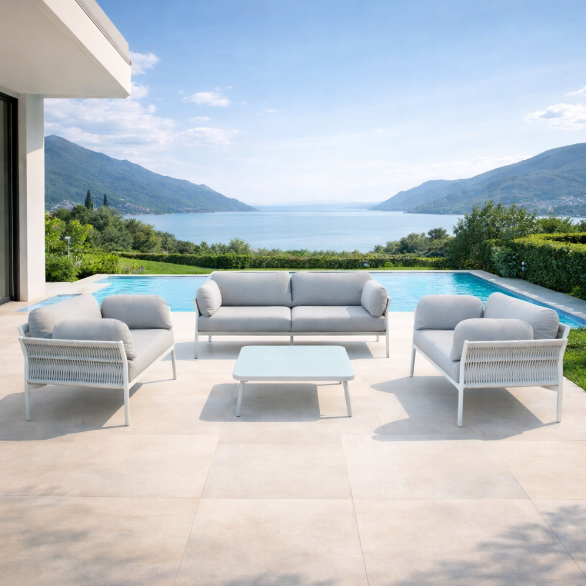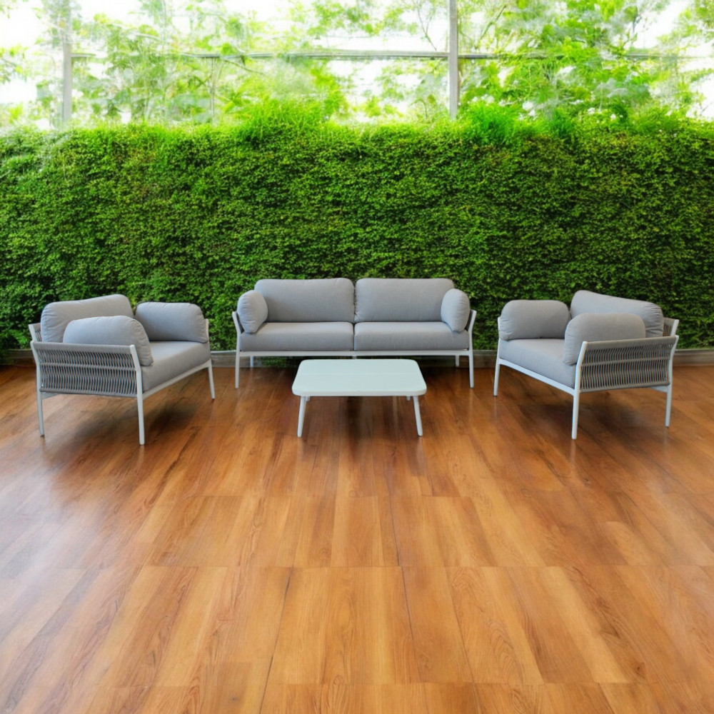 Divano 3 posti, 2 poltrone e tavolino – Eleganza e comfort per esterni e interni