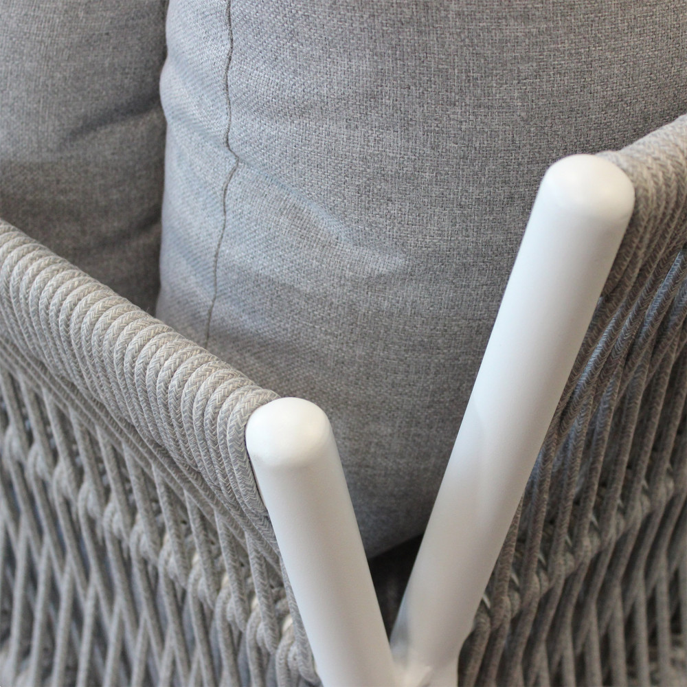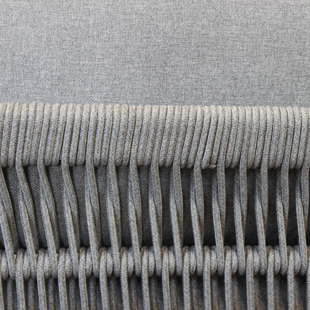 La struttura in alluminio garantisce leggerezza, resistenza e durata nel tempo, mentre il rivestimento in corda PVC e i cuscini in poliestere e cotone assicurano comfort e praticità nell’uso quotidiano.