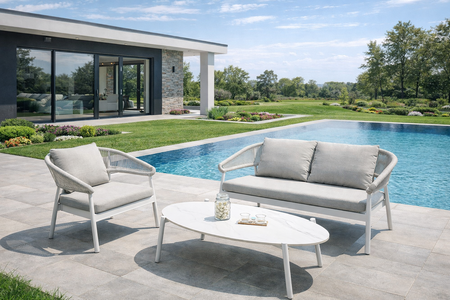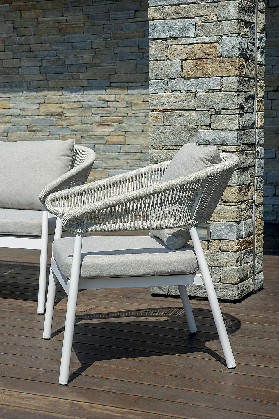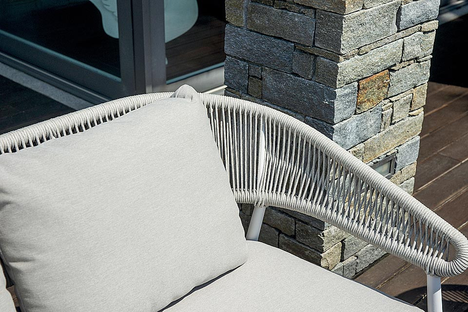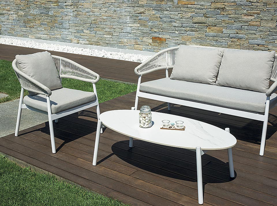 La struttura in alluminio verniciato bianco dona leggerezza visiva e un’estetica moderna, mentre lo schienale in corda intrecciata beige aggiunge un tocco naturale e ricercato. Il tavolino con piano in gres effetto pietra completa il set con una nota sofisticata, perfetta per creare una vera zona living outdoor.