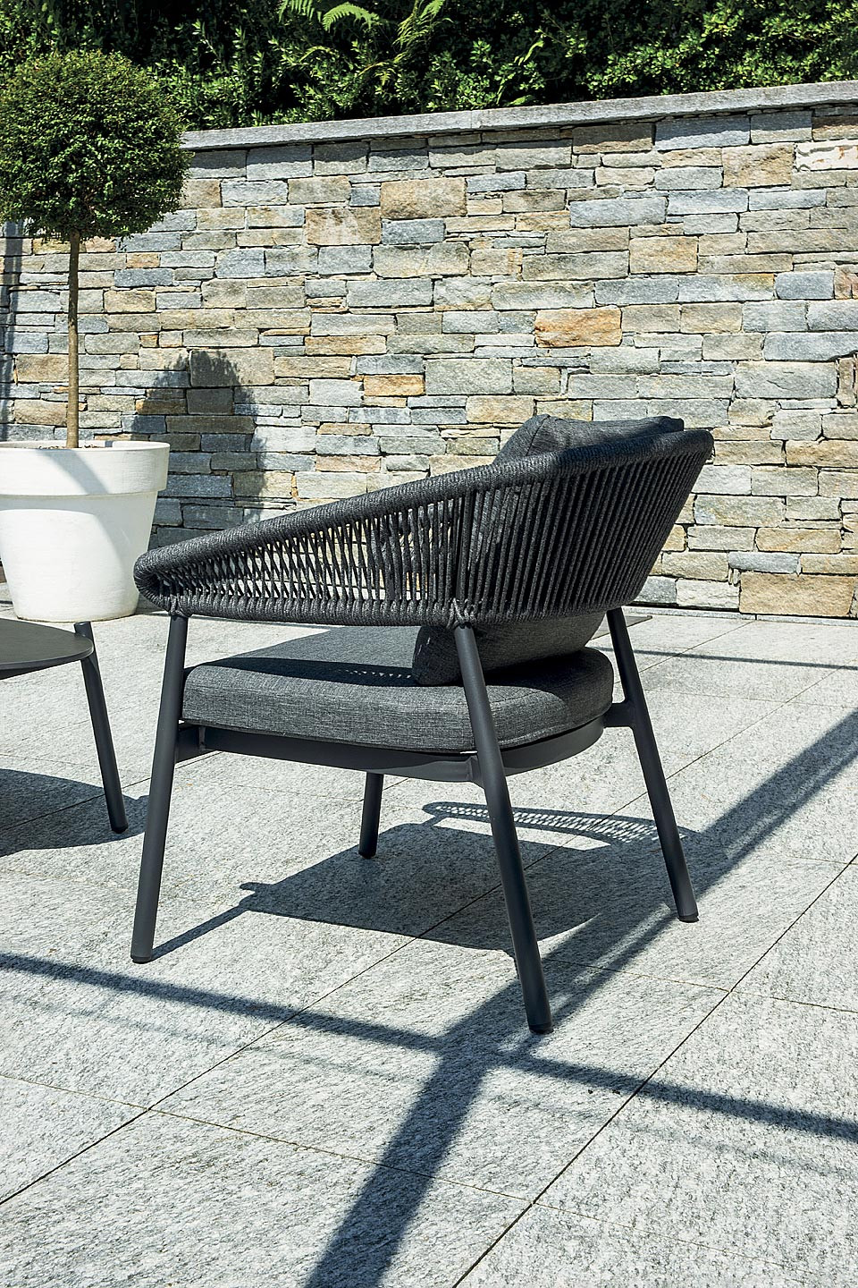 La struttura in alluminio ANTRACITE garantisce leggerezza e resistenza agli agenti atmosferici, mentre lo schienale in corda intrecciata dona un tocco di eleganza e modernità. I cuscini sfoderabili in tessuto GRIGIO CHIARO assicurano massimo comfort e facilità di manutenzione.