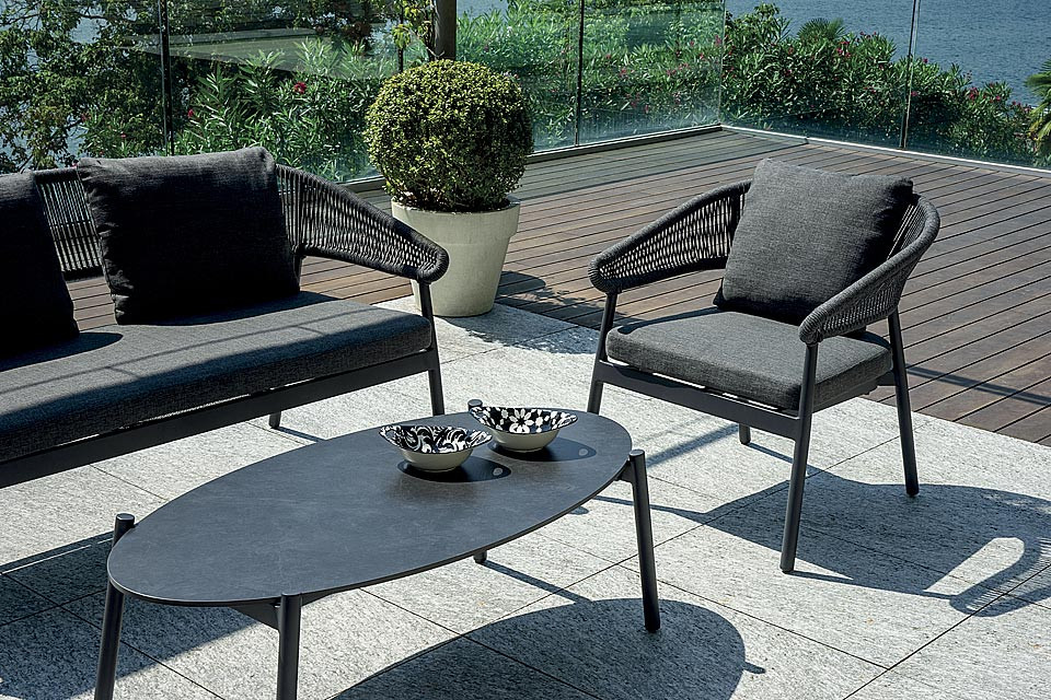 La struttura in alluminio verniciato antracite dona al salotto un aspetto deciso e attuale, mentre lo schienale in corda intrecciata antracite aggiunge leggerezza visiva e un tocco di design esclusivo. Il tavolino con piano in gres effetto pietra completa il set con eleganza e funzionalità, rendendolo ideale sia per il relax che per momenti conviviali.