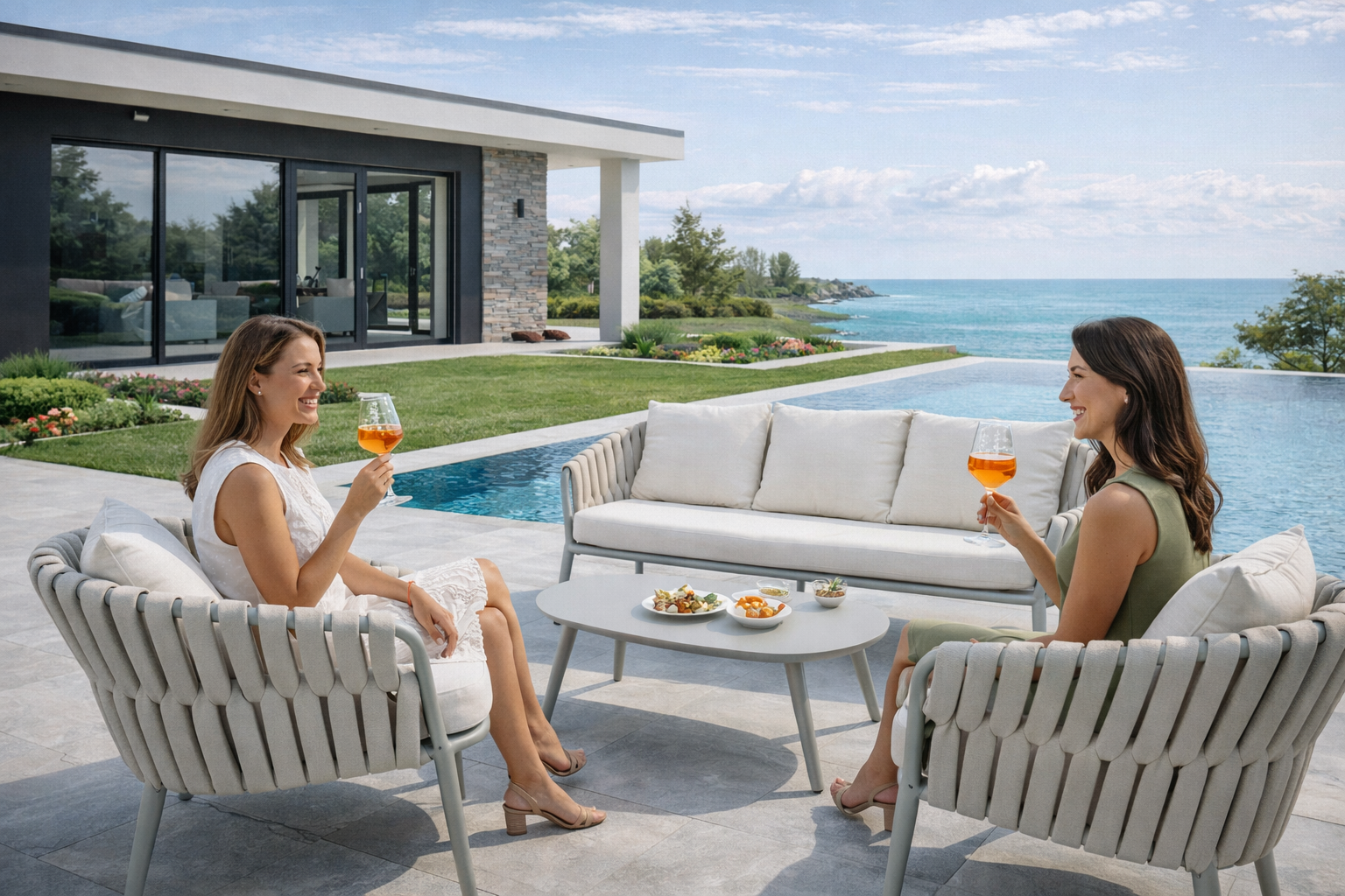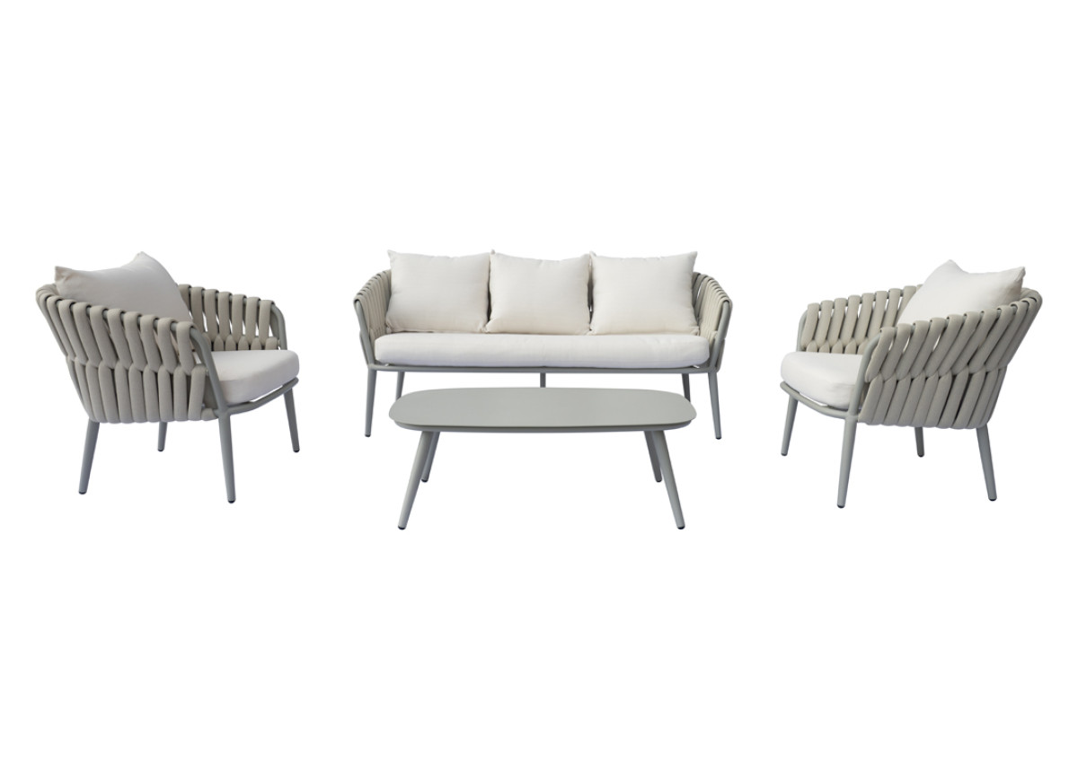 Il Salotto MARBELLA in alluminio creta e corda beige unisce estetica raffinata, comfort elevato e materiali durevoli, trasformando ogni spazio esterno in una vera zona living all’aperto.