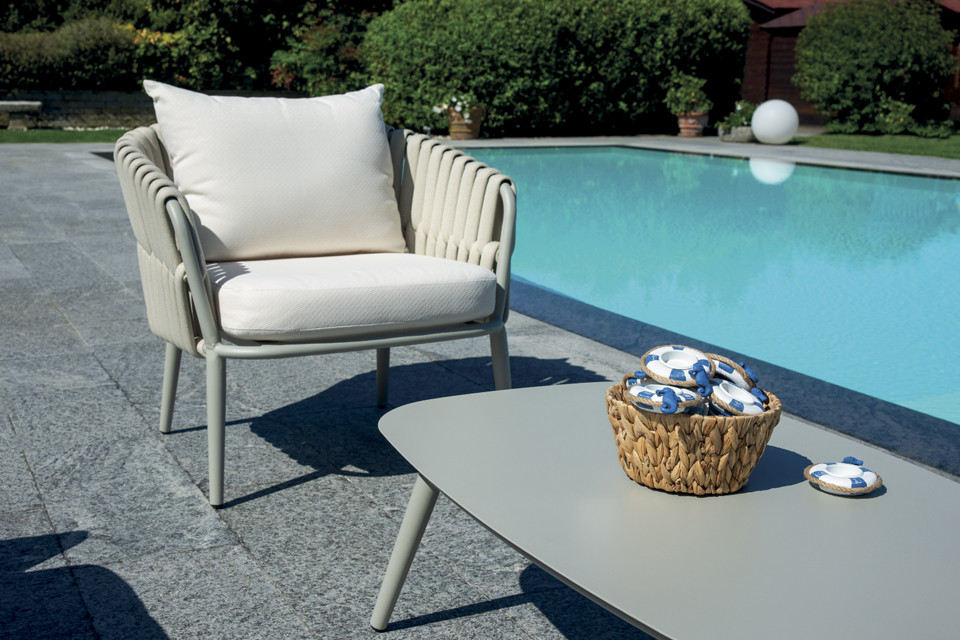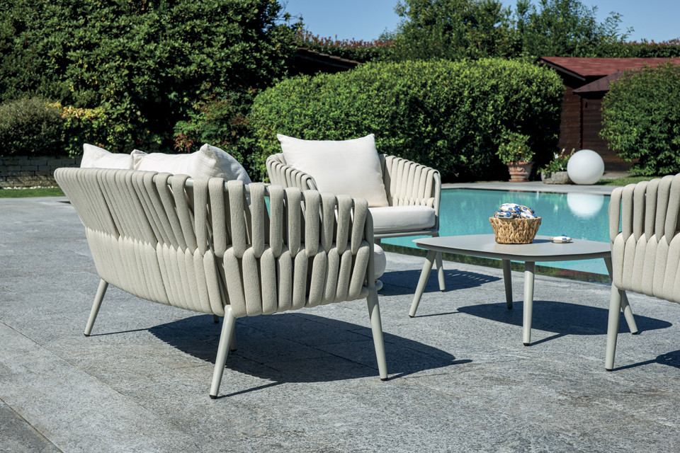 La struttura in alluminio color creta è impreziosita dal rivestimento in corda tecnica imbottita color sabbia, che avvolge schienali e braccioli creando un effetto accogliente e sofisticato. Il tavolino con piano in alluminio completa il set con linee pulite e moderne, mantenendo un’estetica armoniosa e funzionale.