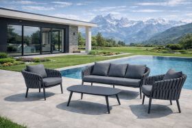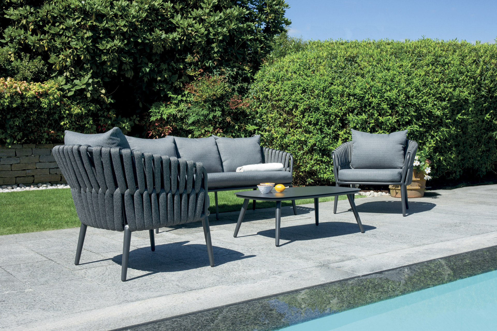 La struttura in alluminio antracite è valorizzata dal rivestimento in corda tecnica imbottita color grigio, che avvolge schienali e braccioli donando un aspetto elegante e accogliente. Il tavolino con piano in alluminio completa il set con un look minimal e coerente, ideale per ambienti outdoor moderni.