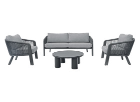 La combinazione tra la struttura in alluminio verniciato antracite e la corda per esterni grigio scuro dona al set un look moderno e ricercato, mentre i cuscini sfoderabili grigio chiaro garantiscono comfort e praticità d’uso.