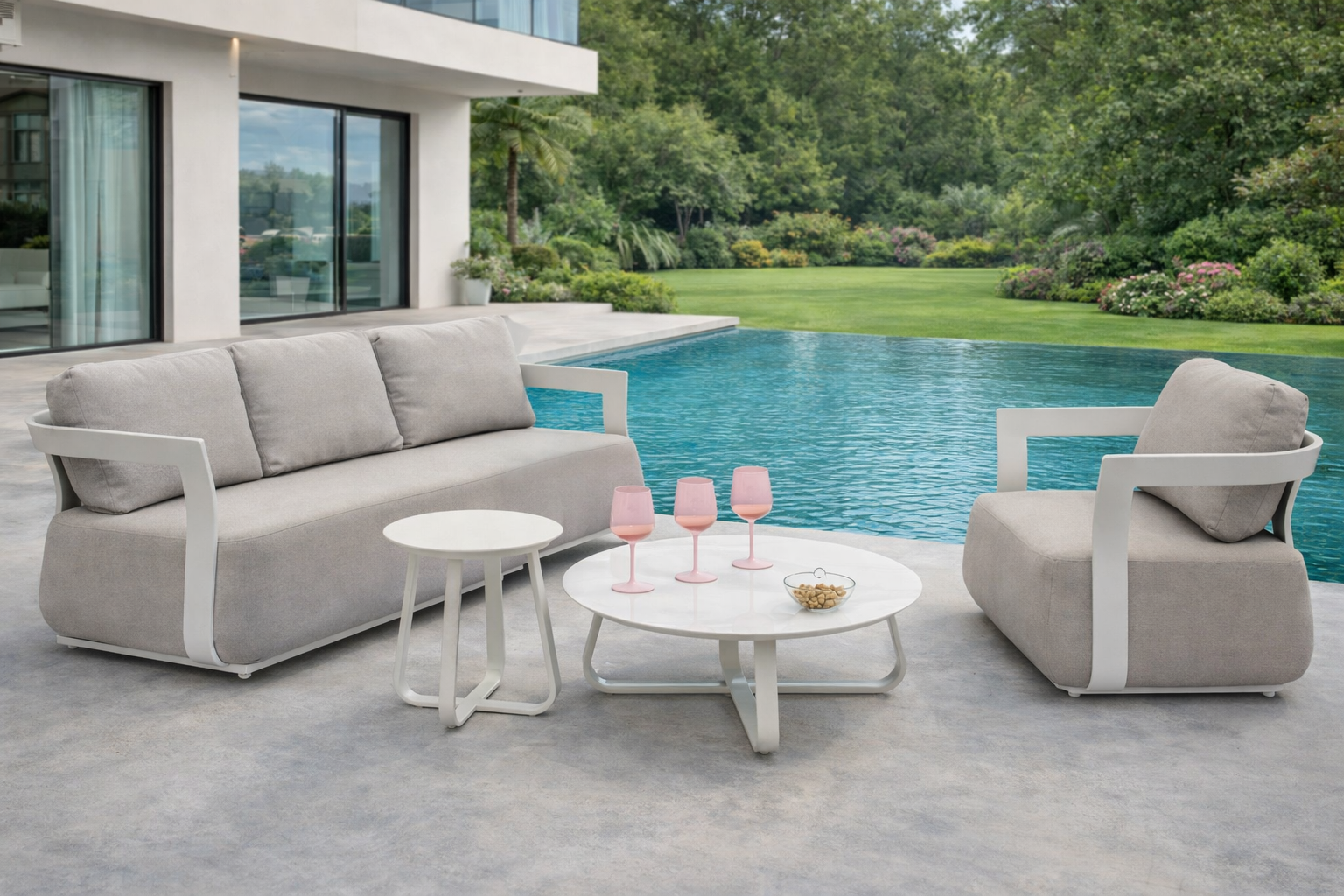 Scegli il Set Monaco in alluminio bianco per valorizzare i tuoi spazi esterni con un arredo raffinato, confortevole e durevole nel tempo. Un salotto completo, pensato per vivere l’outdoor con stile e praticità.