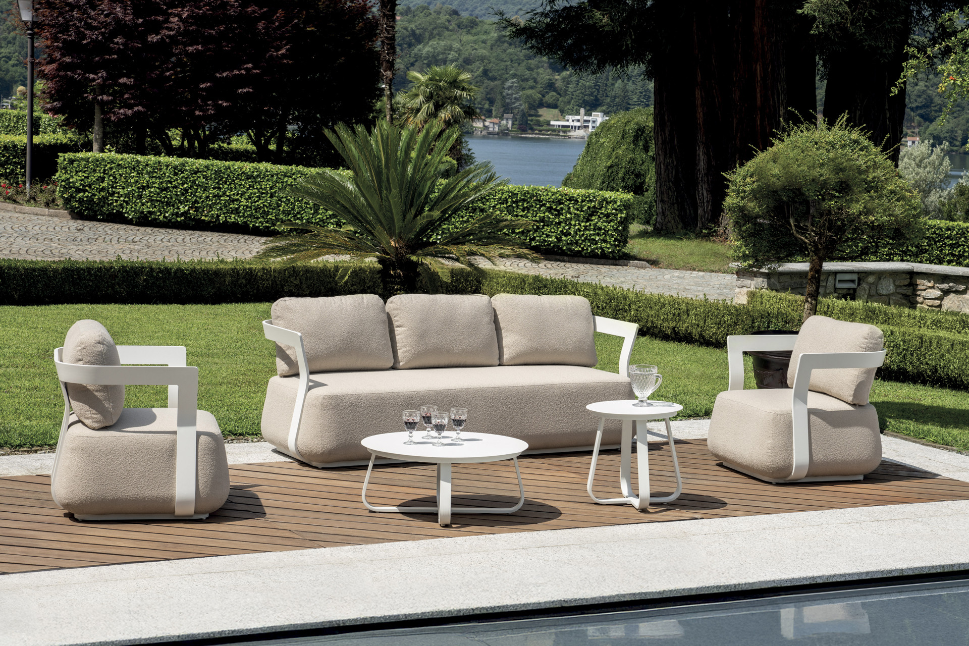 Il salotto Monaco è perfetto per creare una zona living elegante e funzionale in giardino, su terrazzi ampi o in verande coperte. Le sue forme armoniose e la doppia soluzione di tavolini lo rendono estremamente pratico e adatto a ogni momento della giornata, dal relax all’aperitivo.