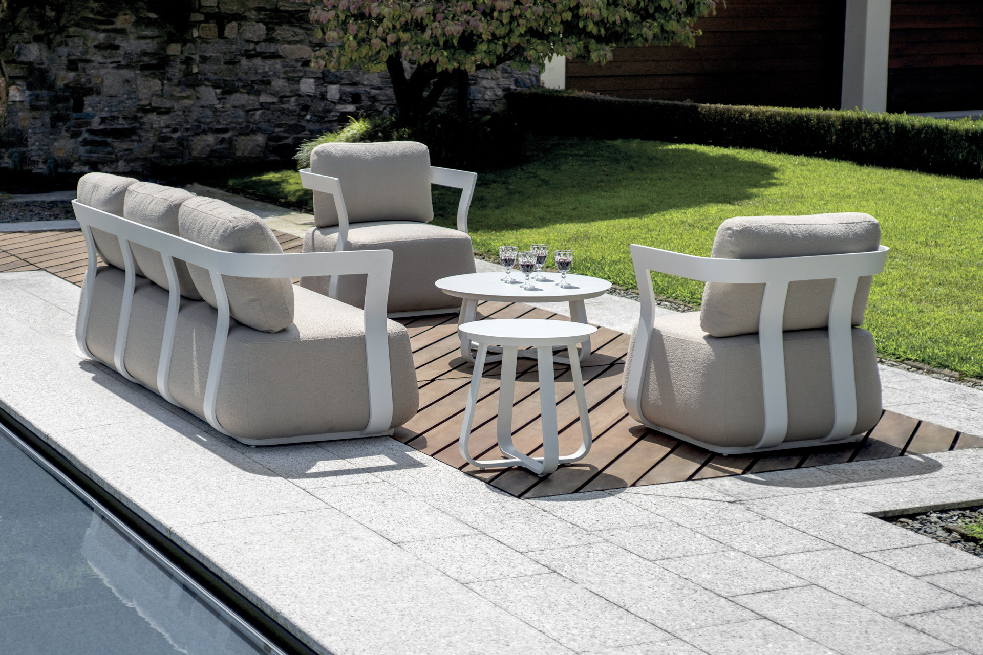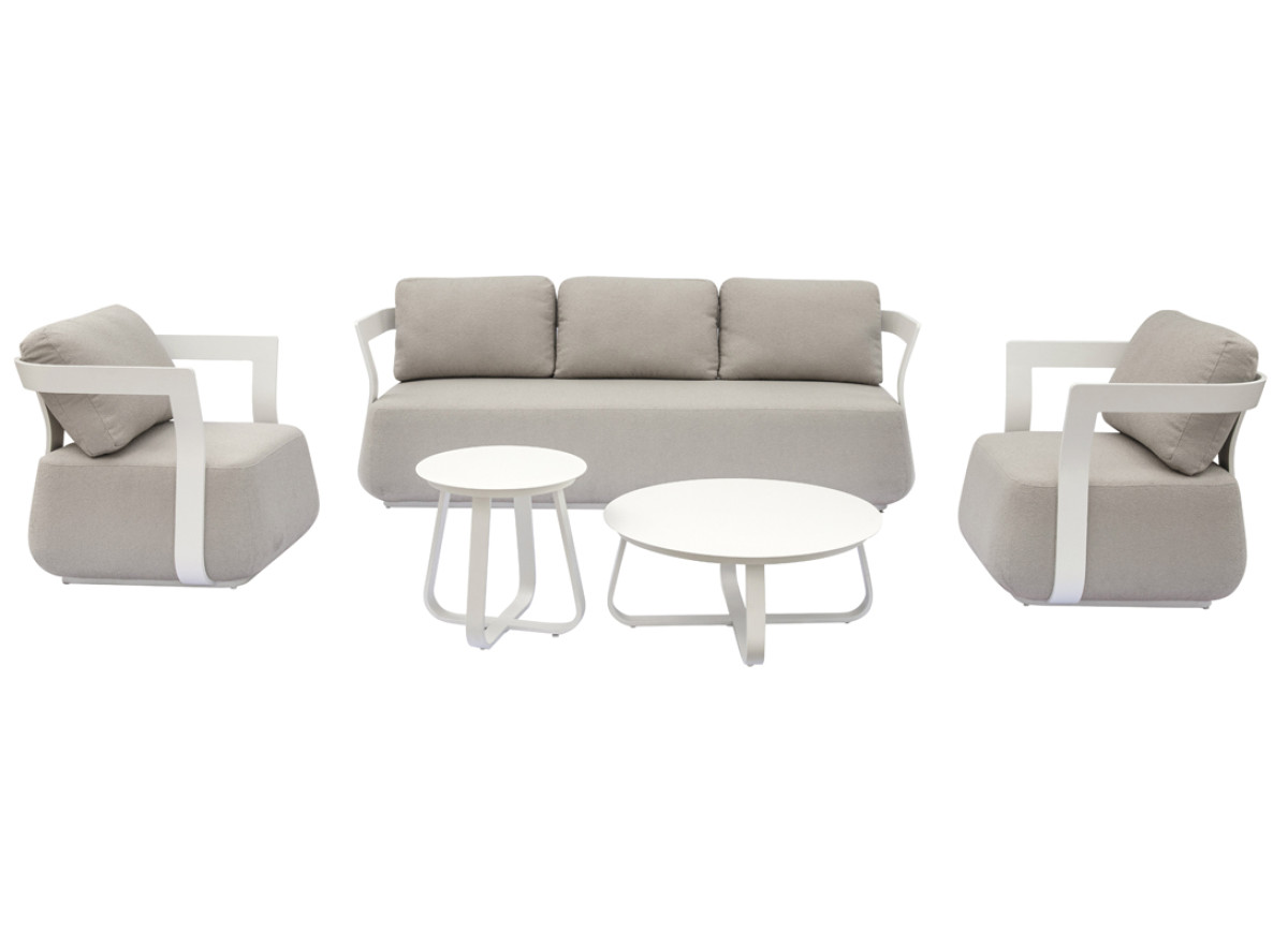 La struttura in alluminio verniciato bianco garantisce leggerezza, solidità e un’elevata resistenza agli agenti atmosferici. I cuscini sfoderabili color tortora chiaro donano un comfort eccellente e un raffinato contrasto cromatico, facilmente abbinabile a qualsiasi contesto outdoor. Il set è completato da due tavolini rotondi in alluminio, pratici e versatili, ideali come piano d’appoggio o elemento decorativo.