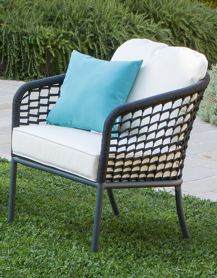 La struttura in alluminio verniciato antracite si distingue per il design sottile ed elegante, valorizzato dall’intreccio in corda grigia che dona carattere e raffinatezza all’insieme. I cuscini bianchi creano un piacevole contrasto cromatico e assicurano comfort elevato.