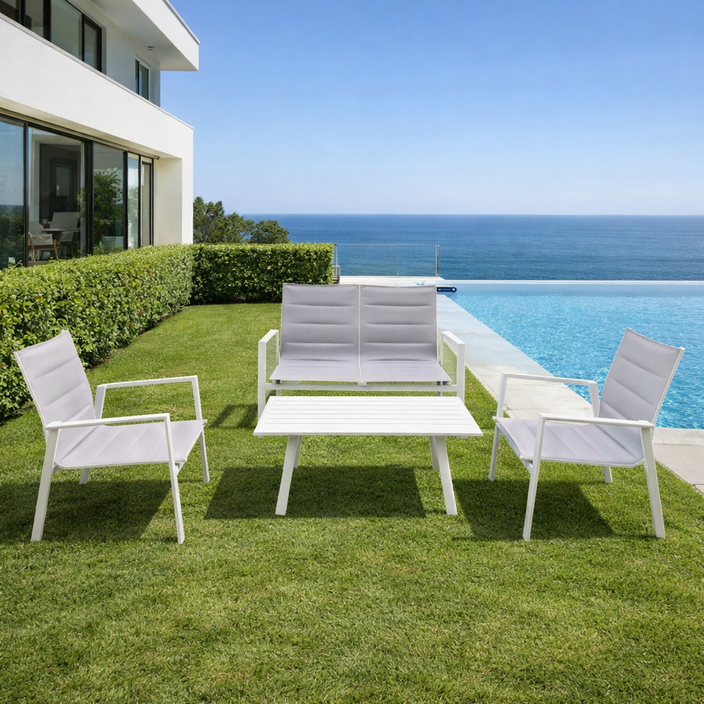 Comode poltrone e un tavolo elegante invitano a trascorrere ore piacevoli in totale relax. La combinazione di alluminio e textilene dona al set un’estetica pulita e moderna, garantendo al tempo stesso leggerezza e facilità di spostamento.