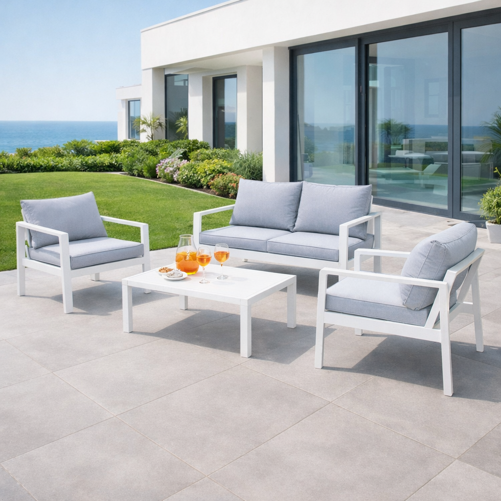 Il set è composto da un divano 2 posti, due comode poltrone con braccioli e un pratico tavolino, ideali per accogliere fino a 4 persone. Grazie alle forme ampie e al rivestimento confortevole, il salottino garantisce un’ottima esperienza di comfort, valorizzando qualsiasi spazio esterno.