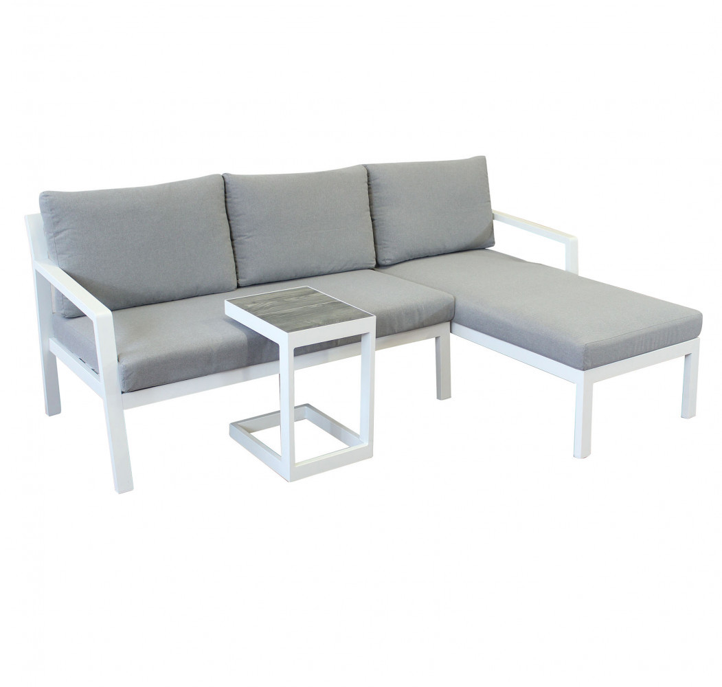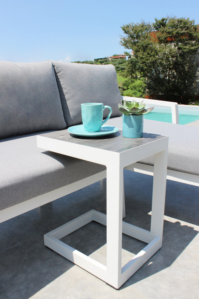 Il Divano con Tavolino KOMODO è una soluzione elegante e modulare per arredare con stile giardini, terrazzi e verande. La struttura in alluminio verniciato bianco garantisce leggerezza, resistenza agli agenti atmosferici e un’estetica moderna, perfetta per ambienti outdoor contemporanei.