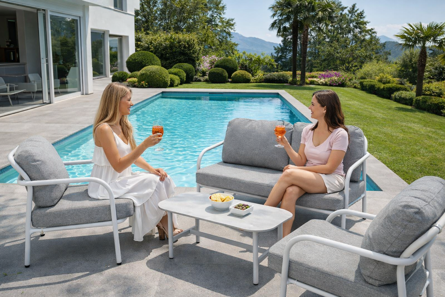 Il Salotto ALMERIA bianco si inserisce perfettamente in contesti outdoor moderni, mediterranei o minimal, valorizzando gli spazi con luminosità e sobrietà. Perfetto per momenti di relax, conversazione o convivialità all’aperto, è una soluzione completa e versatile per l’arredo esterno.