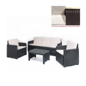Salotto in resina plastica effetto rattan di colore grigio composto da divano da 3 posti completo di poltrone e cuscini.