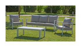 Salotto da giardino in alluminio composto da due poltrone, un divano tre posti e un tavolino rettangolare. Puoi scegliere fra i due colori bianco e sabbia con cuscini abbinati in grigio o sabbia.