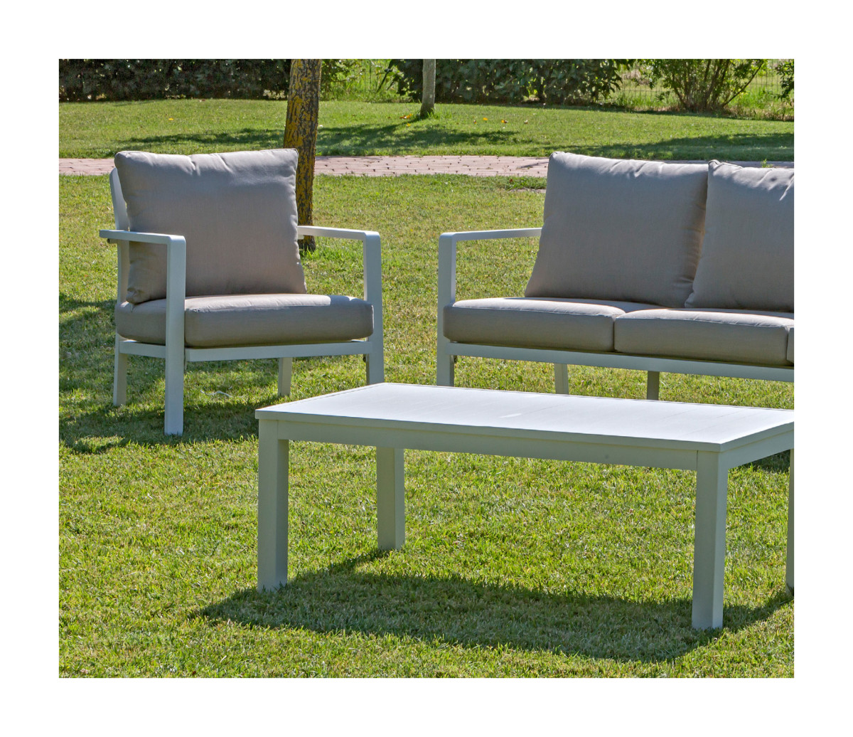 Salotto da giardino in alluminio composto da due poltrone, un divano due posti e un tavolino rettangolare. Il set è disponibile nei colori antracite e tortora con cuscini abbinati in grigio o sabbia.