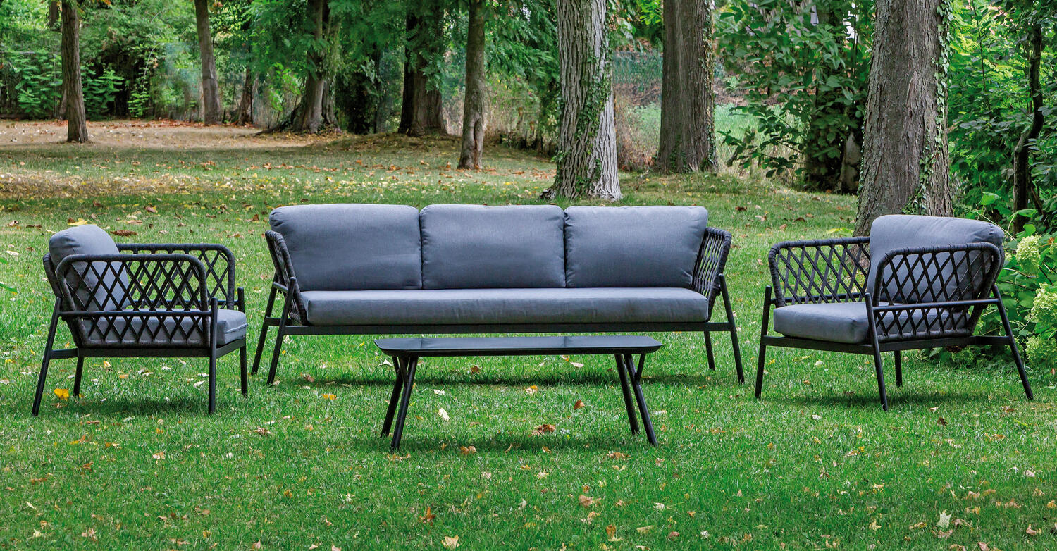 Grazioso salotto da giardino in metallo dalle linee essenziali e raffinate, composto da un divano tre posti, due poltrone e un tavolino rettangolare. La struttura in alluminio verniciato a polvere in color antracite è impreziosita dal motivo intrecciato a rombi in corda sintetica di colore grigio e cuscini in tessuto poliestere da 230gr di colore grigio. Un set da giardino in alluminio ti garantisce una grande durevolezza e resistenza alle intemperie. Si tratta inoltre di mobili da esterno leggeri, caratteristica molto utile quando si tratta di spostarli da un punto all?altro o riporli alla fine della bella stagione.