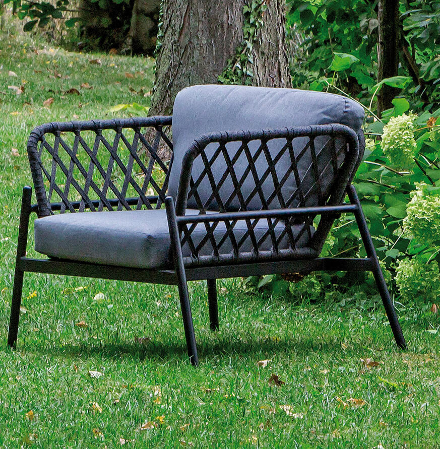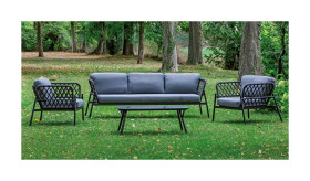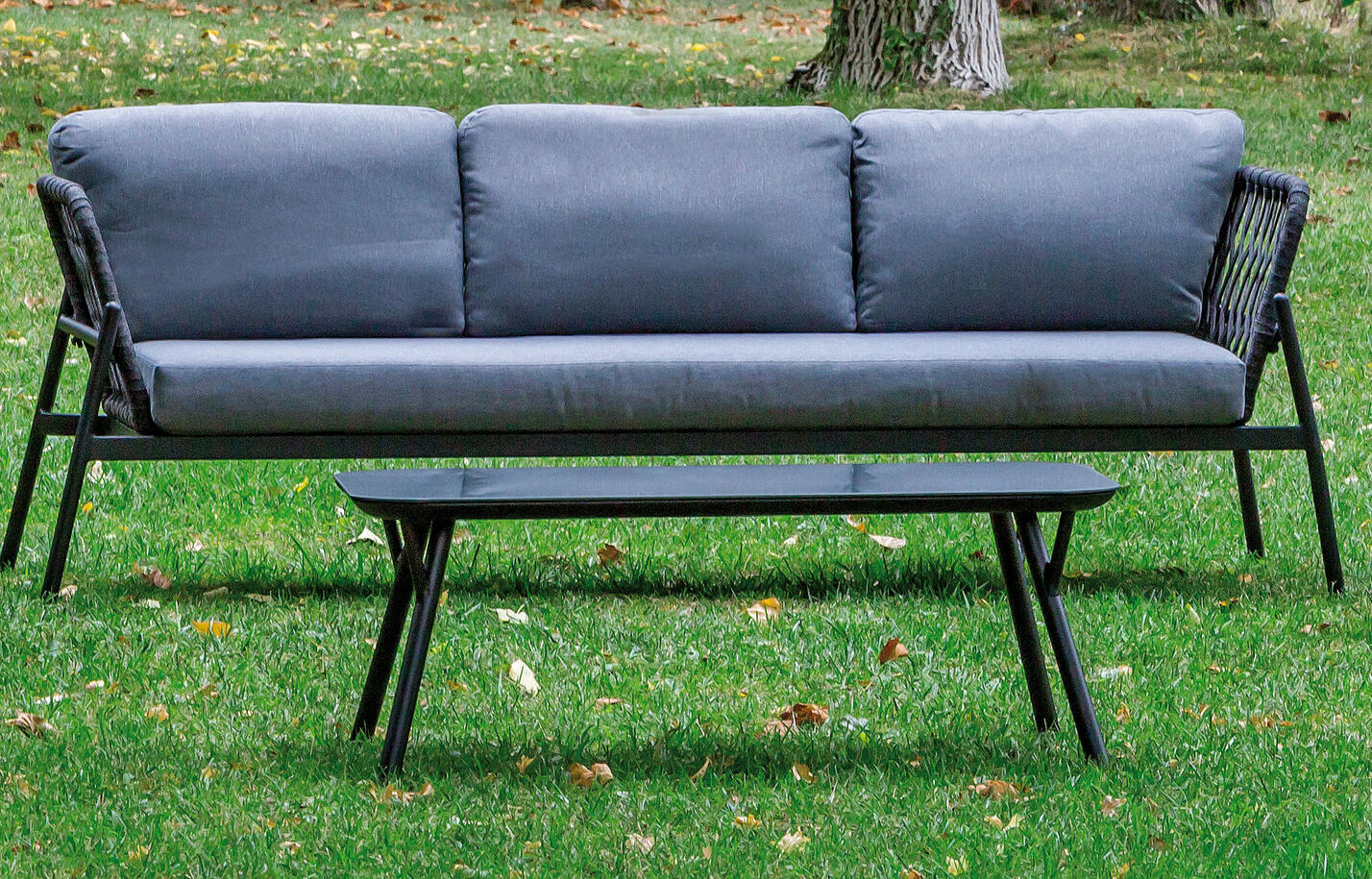 Salotto Minerva ? set composto da 1 divano, 2 poltrone, 1 tavolino ? struttura in alluminio verniciato a polvere in colore nero, corda sintetica colore grigio e cuscineria in tessuto poliestere da 230 gr colore grigio ? \r\ndivano: h. 71 x l. 200 x p. 79.5 cm\r\npoltrona: h. 71 x l. 100 x p. 79.5 cm \r\ntavolino: h. 41 x l. 110 x p. 60 cm