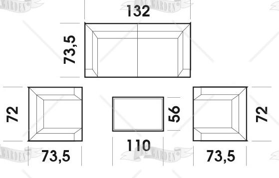 divano: h. 77 x l. 132 x p. 73.5 cm