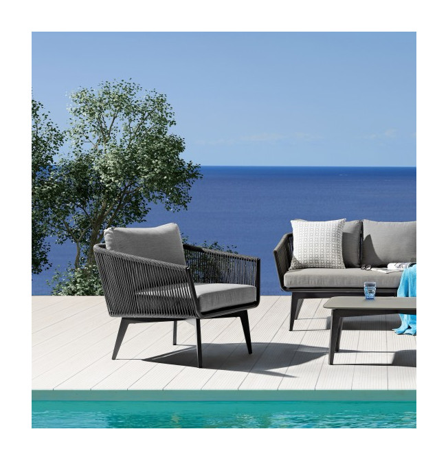Comode poltrone e un elegante tavolo invitano a trascorre piacevoli ore insieme. Il set in alluminio e textilene piace non solo per l?eleganza ma anche per la sua lunga durata.