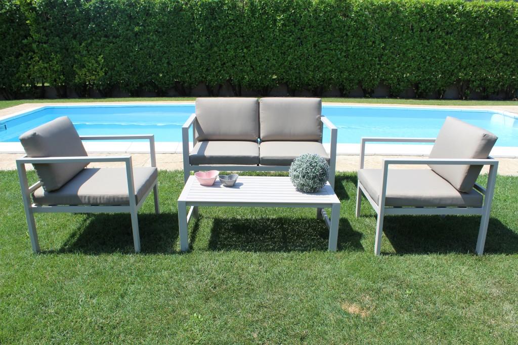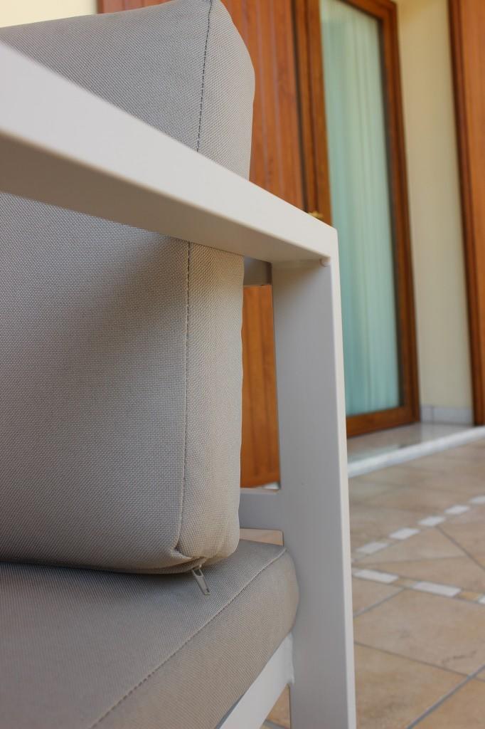 IL SALOTTO TRENTO, nella sua versione standard, è in color bianco, sia per i cuscini sia per la verniciatura dell'alluminio;