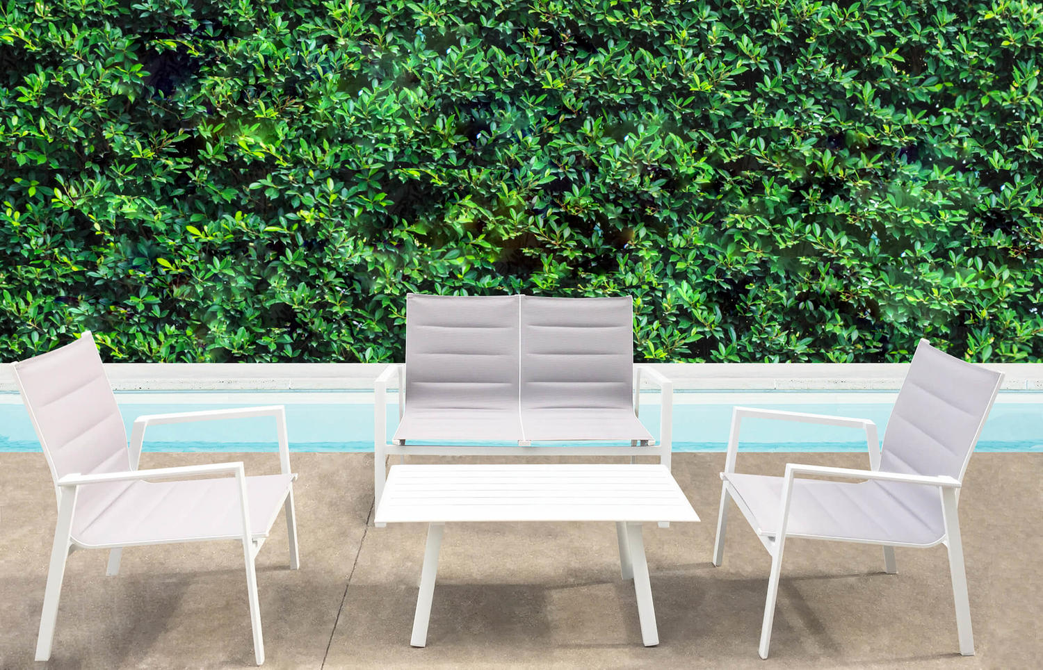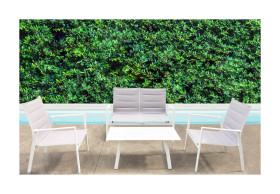 IL SALOTTO in alluminio standard, è in color bianco, mentre il textilene GRIGIO CHIARO