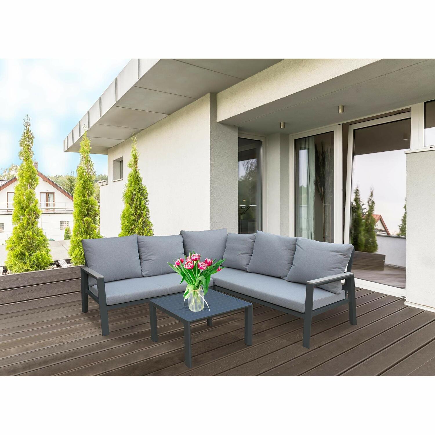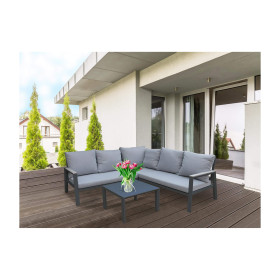 Sfrutta appieno le potenzialità del tuo spazio all'aperto arredando il tuo giardino con complementi d'arredo resistenti e dall'aspetto accattivante e moderno. Come questo set relax composto da un comodo divano angolare con otto cuscini rivestiti in tessuto grigio e un tavolino basso da caffè con struttura in alluminio verniciato bianco.