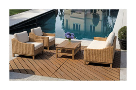 Linee moderne e pulite per il salotto da giardino Maiori di GREENWOOD. Design contemporaneo e materiali caldi come il legno ed il rattan naturale fanno di Maiori il salotto perfetto per arredare la zona relax del giardino o della terrazza. Il set da giardino è composto da un divano e due poltrone completi di comodi cuscini sfoderabili in policotone ecrù e un tavolino in legno.