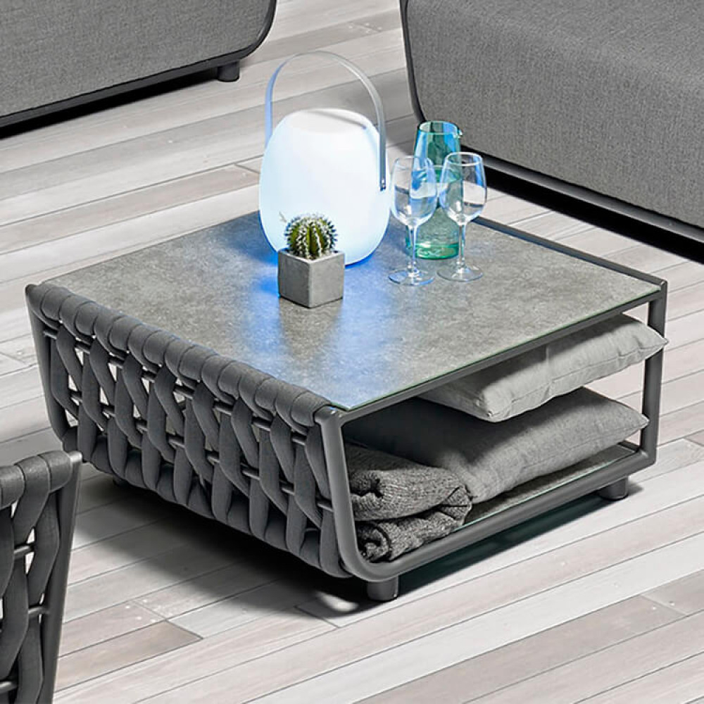 TAVOLINO GALAPAGOS Struttura in alluminio ANTRACITE rivestimento in corda in PVC con imbottitura in gomma vetro 8 mm Dimensioni: cm 81 x 71 x 40 h