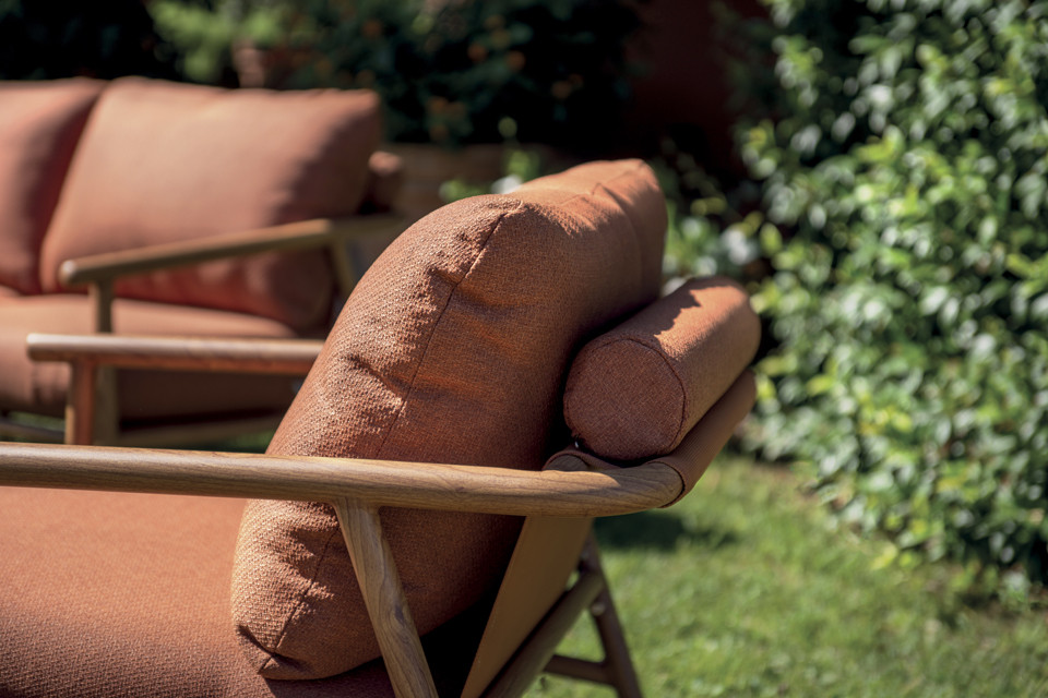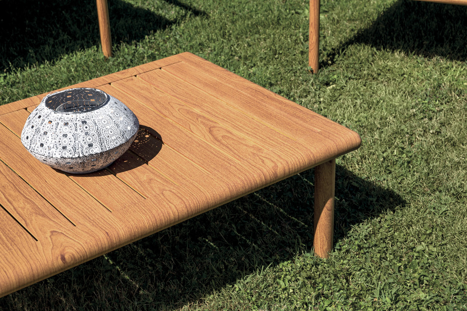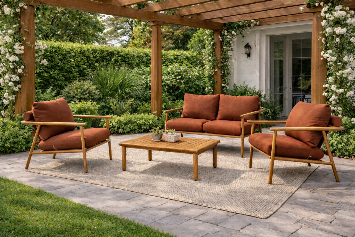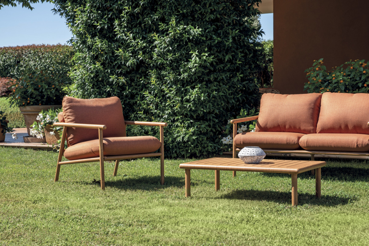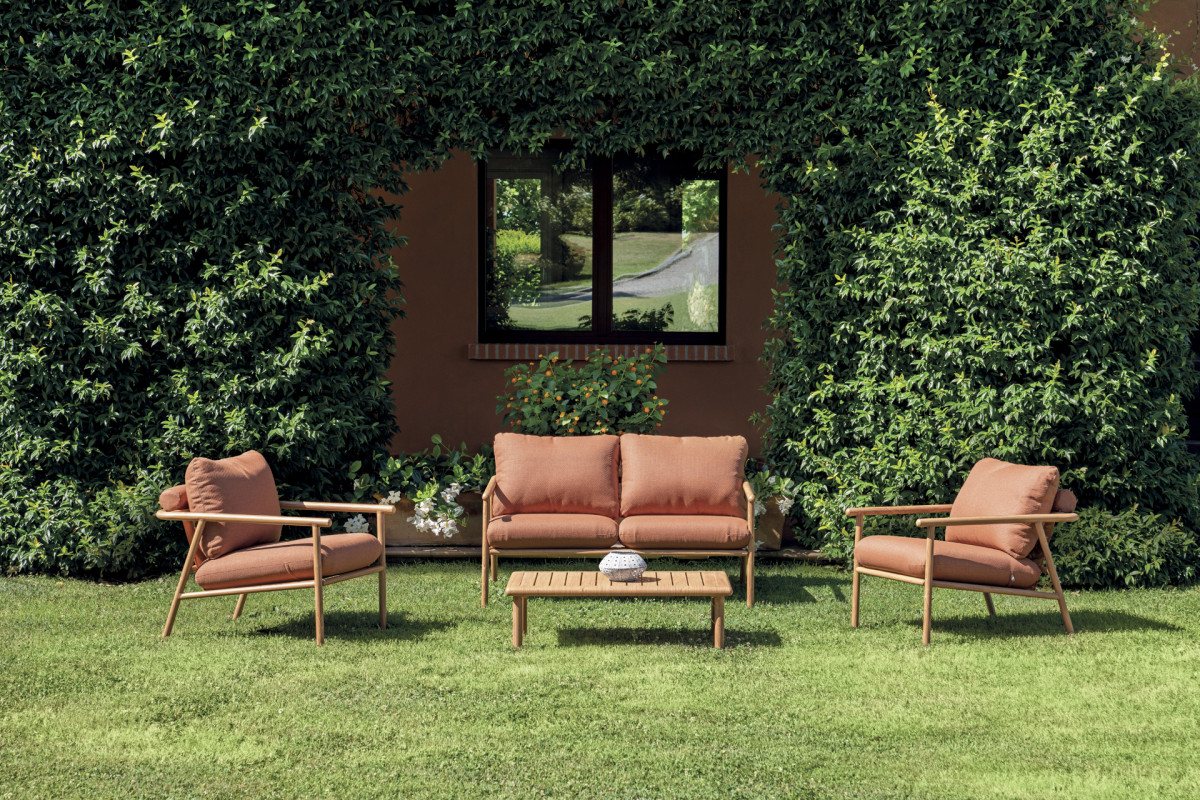 Il set è composto da 2 poltrone, 1 divano a 2 posti e 1 tavolino con piano a doghe in alluminio, per un totale di 4 posti confortevoli. La struttura in alluminio verniciato effetto legno garantisce leggerezza, stabilità e un’elevata resistenza agli agenti atmosferici, riducendo al minimo la manutenzione.