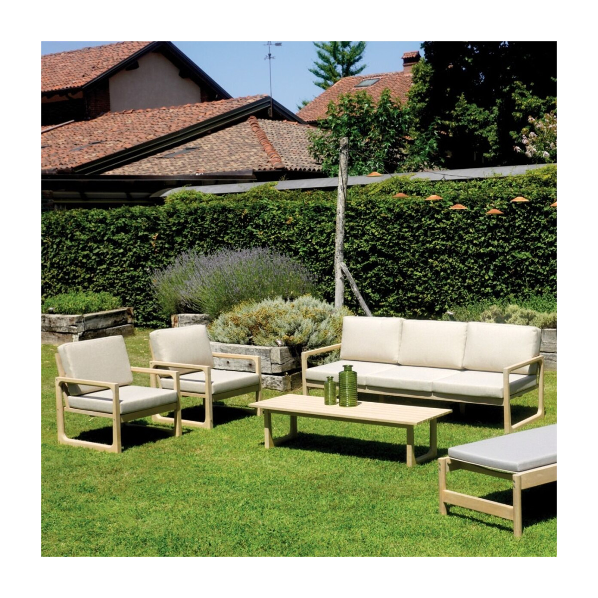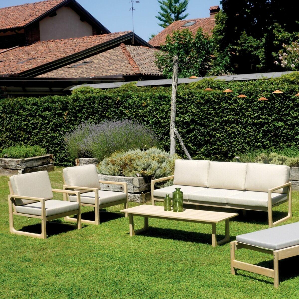 Divano, tavolino, soffici cuscini e pouf poggiapiedi. greenwood ha tutto ciò che occorre per uno spazio outdoor organizzato come si deve.