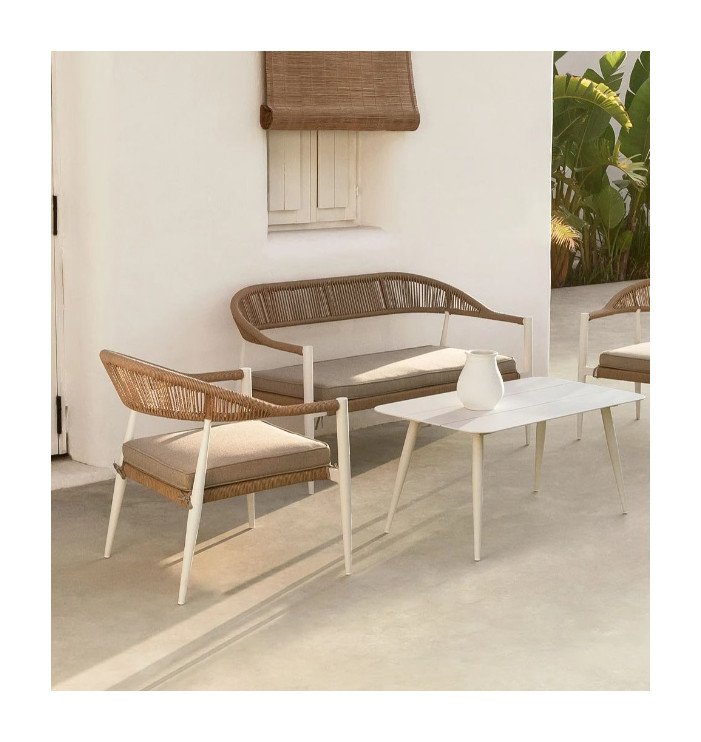 SET composto da 2 poltrone, 1 divano e un tavolino con piano a doghe di alluminio 100 x 55 x 45 cm - Struttura in alluminio BIANCO - Seduta e schienale in twist wicker ? 5 mm grigio - cuscini sfoderabili grigio chiaro.