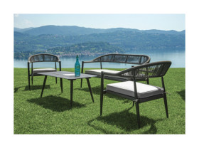 SET composto da 2 poltrone, 1 divano e un tavolino con piano a doghe di alluminio 100 x 55 x 45 cm - Struttura in alluminio antracite G - Seduta e schienale in twist wicker ? 5 mm grigio - cuscini sfoderabili grigio chiaro.