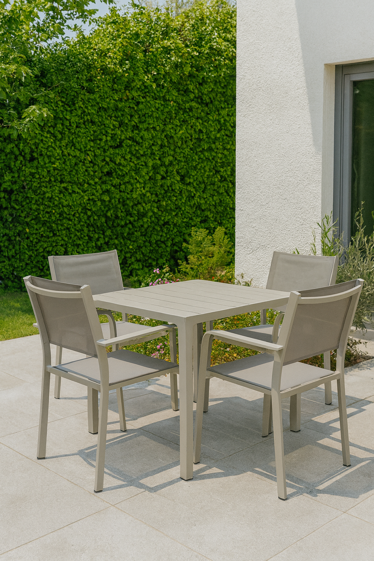 Realizzata con struttura in alluminio verniciato color taupe semiopaco, la sedia ZANTE garantisce leggerezza, stabilità e un’elevata resistenza agli agenti atmosferici. Seduta e schienale in textilene taupe assicurano comfort ottimale, traspirabilità e facilità di manutenzione, rendendola perfetta per l’uso quotidiano all’aperto.