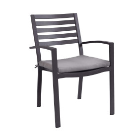 Questa coppia di poltrone da giardino in alluminio semiopaco arreda la tua zona pranzo all'aria aperta con uno stile nuovo e funzionale. A rendere ancora più comoda e confortevole la seduta un cuscino colore marrone.