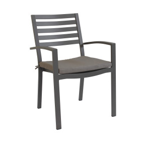 Questa coppia di poltrone da giardino in alluminio semiopaco arreda la tua zona pranzo all'aria aperta con uno stile nuovo e funzionale. A rendere ancora più comoda e confortevole la seduta un cuscino colore marrone.
