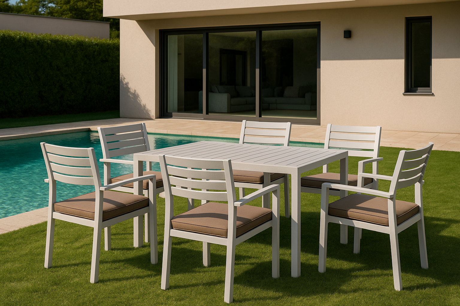 La poltrona da giardino con braccioli in alluminio verniciato color TORTORA chiaro rappresenta una soluzione elegante e funzionale per arredare con gusto i tuoi spazi esterni. Ideale per la zona pranzo o per un’area relax all’aperto, combina comfort, leggerezza e resistenza in un design moderno e raffinato.