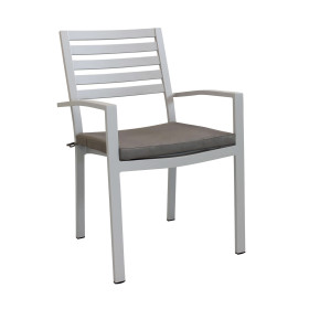 Questa coppia di poltrone da giardino in alluminio semiopaco arreda la tua zona pranzo all'aria aperta con uno stile nuovo e funzionale. A rendere ancora più comoda e confortevole la seduta un cuscino colore marrone.
