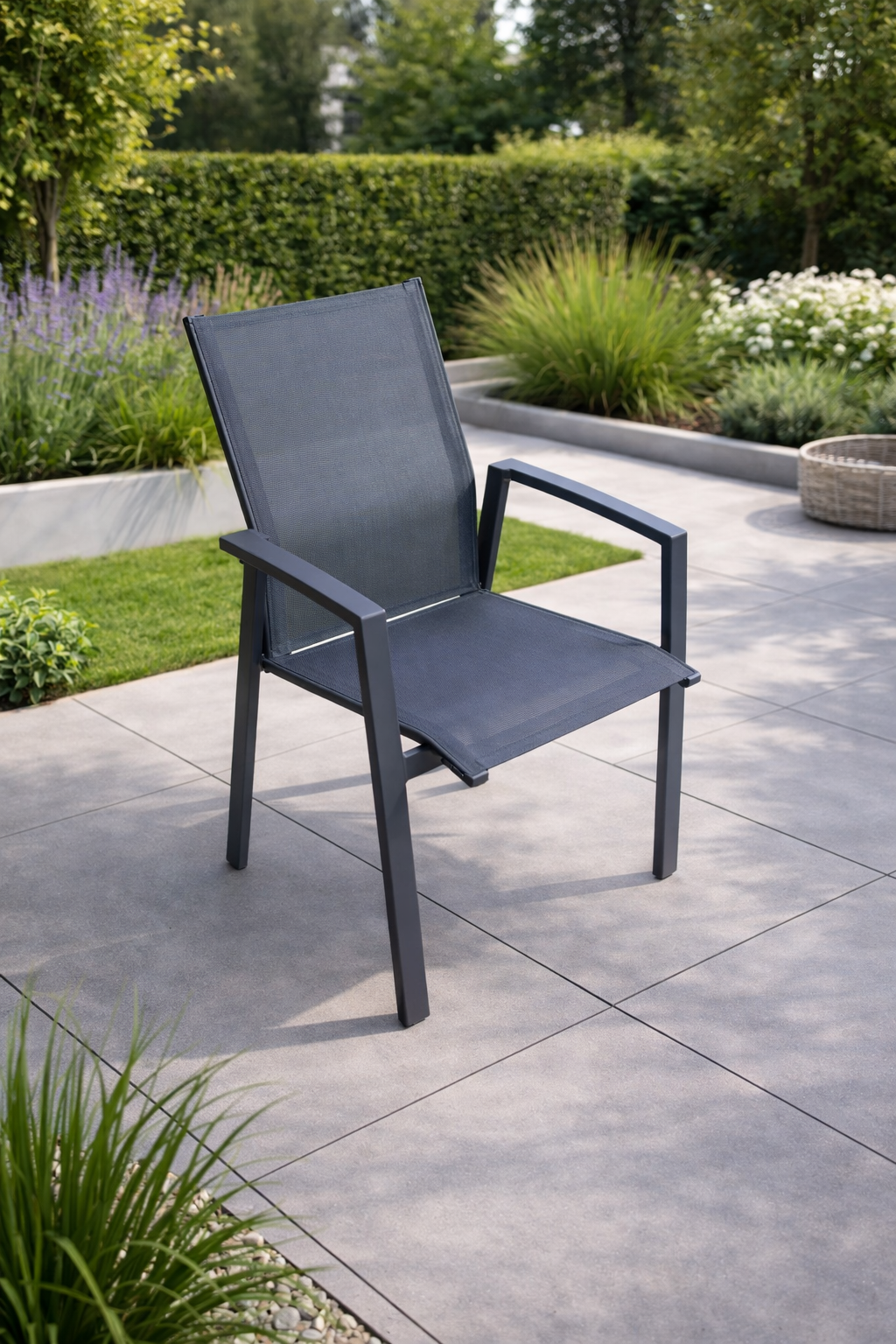 La seduta e lo schienale in textilene Antracite assicurano comfort, traspirabilità e rapida asciugatura, rendendo la poltrona perfetta anche durante le giornate più calde.