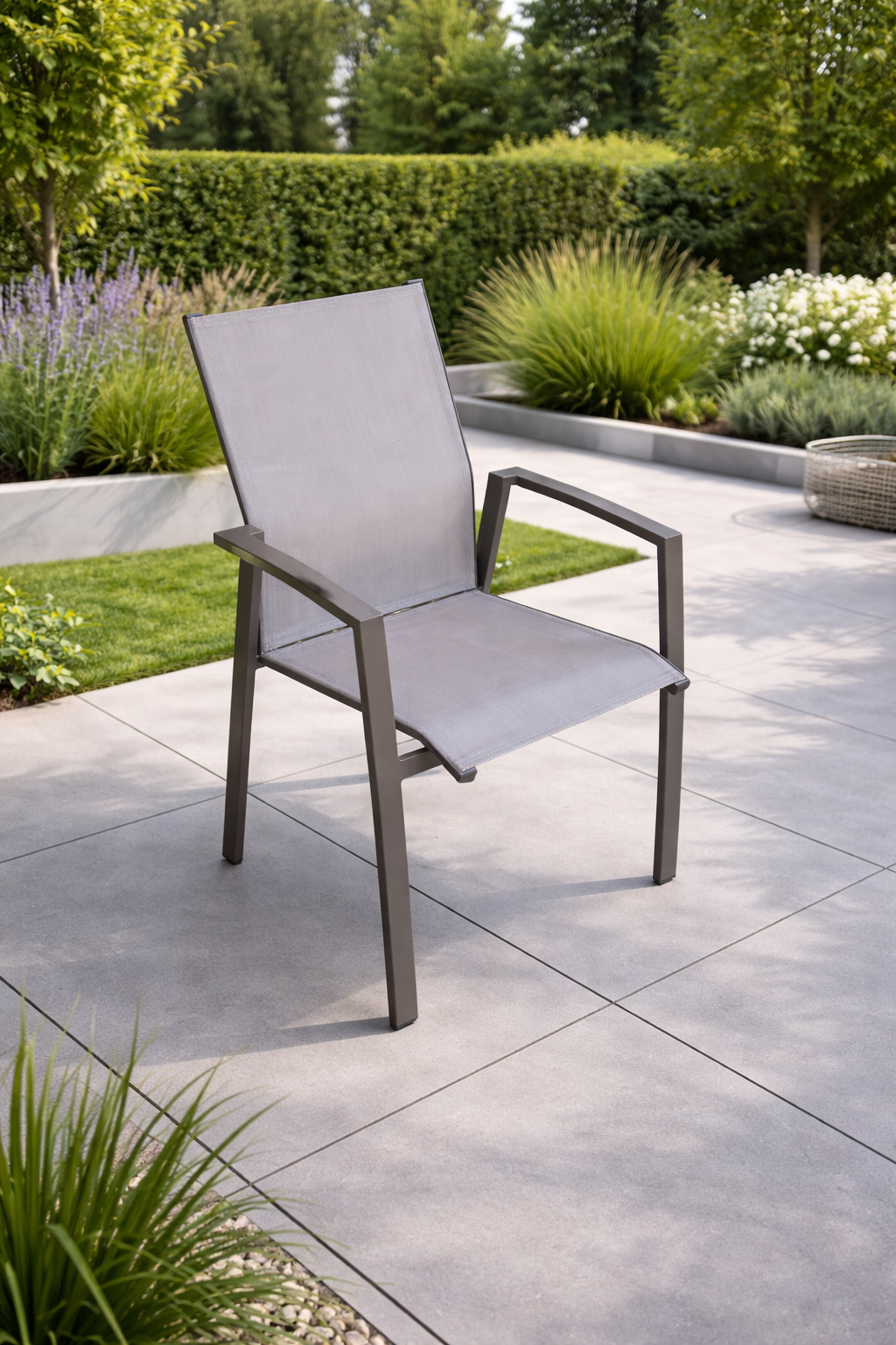 Pronto alla bella stagione? sedie con braccioli da esterno con struttura in alluminio, seduta e schienale in textilene.