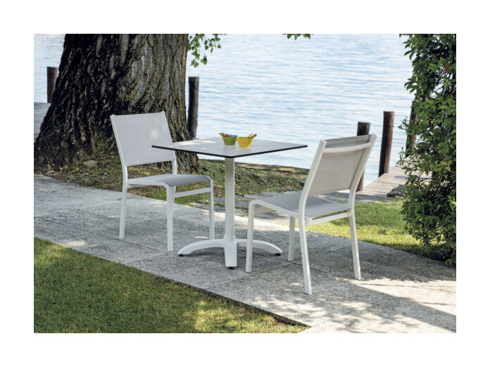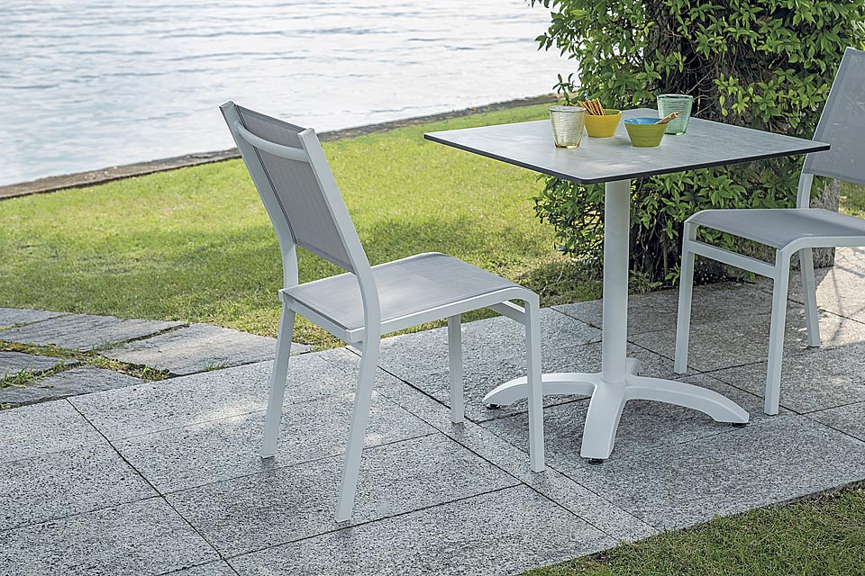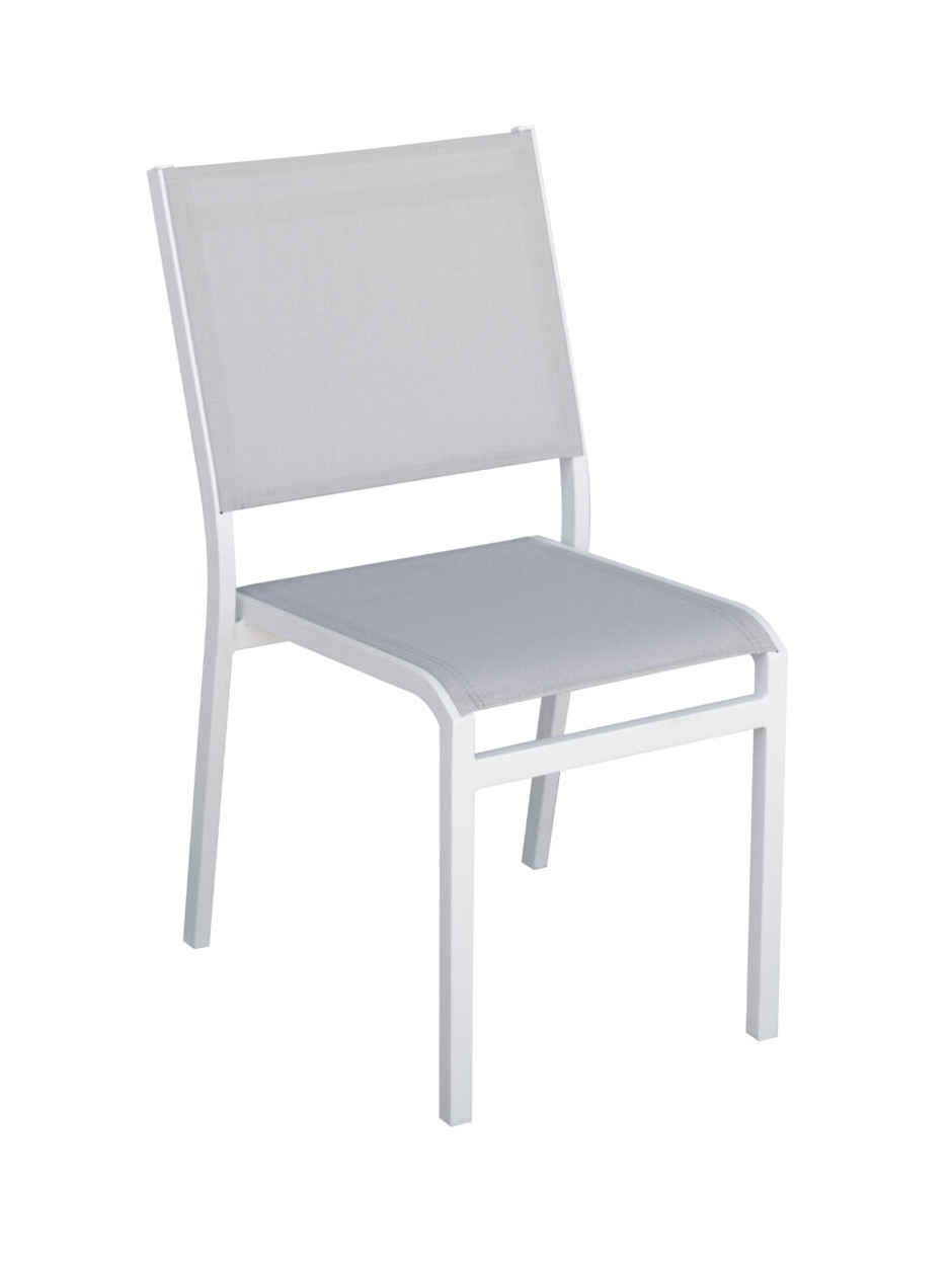 La seduta e lo schienale in textilene grigio chiaro assicurano comfort, traspirabilità e facilità di manutenzione. Il design senza braccioli la rende pratica e versatile, ideale per essere accostata a tavoli da giardino, terrazze, balconi o ambienti contract come bar e ristoranti.