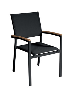 Sedia da esterno con struttura in alluminio con braccioli in resinwood grigio e seduta e schienale in textilene nera.