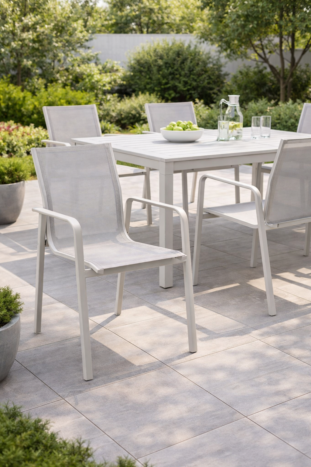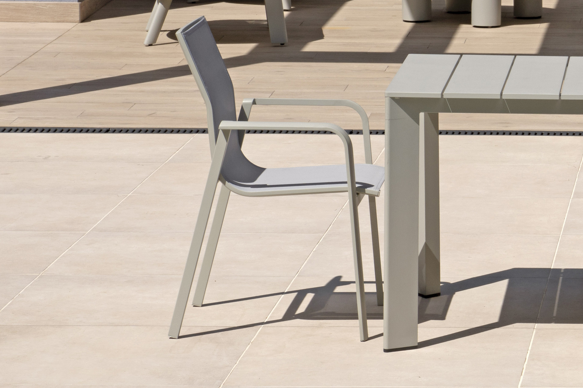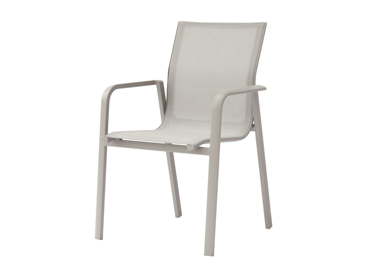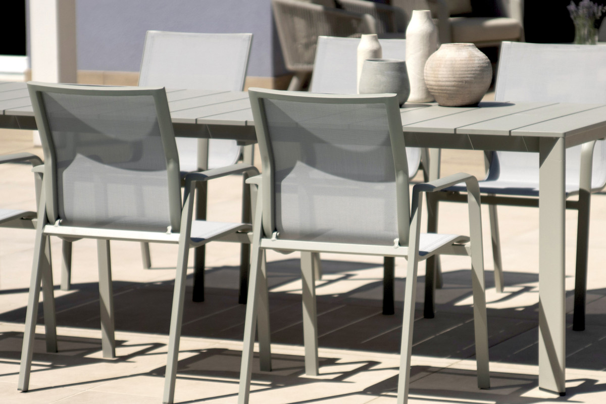 La struttura in alluminio verniciato tortora garantisce leggerezza, solidità e un’elevata resistenza agli agenti atmosferici e alla corrosione. Il textilene grigio chiaro, traspirante e confortevole, assicura una seduta piacevole anche nelle giornate più calde ed è estremamente semplice da pulire e mantenere.