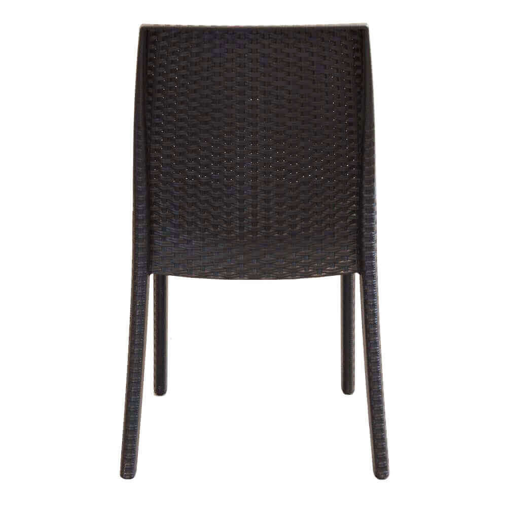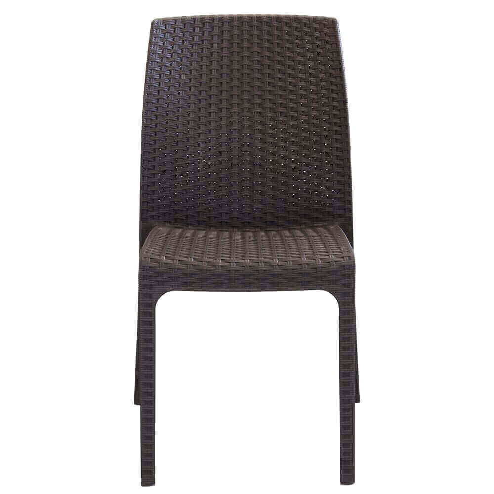 La sedia è realizzata con struttura in polipropilene stampato marrone effetto wicker, materiale resistente e adatto all’utilizzo esterno. La finitura intrecciata richiama l’estetica del wicker tradizionale, donando un aspetto elegante e curato unito alla praticità di una superficie facile da pulire e mantenere.