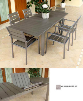 La costante ricerca di prodotti innovativi giunge nell'arredo outdoor, proponendo un nuovo tavolo da pranzo realizzato con struttura in alluminio spazzolato e top in polywood. Il polywood è un particolare materiale innovativo perfetto per l'arredo dei tuoi spazi esterni, siano essi il giardino, la terrazza o il gazebo grazie alla sua grandissima resistenza agli agenti atmosferici.