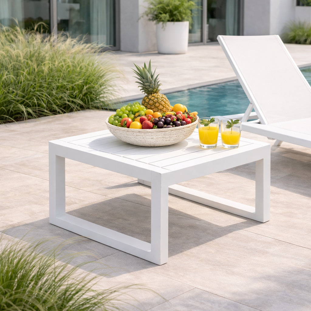 La struttura è realizzata in alluminio verniciato a polvere color bianco, materiale leggero e altamente resistente agli agenti atmosferici. La finitura bianca dona al tavolino un aspetto pulito e contemporaneo, ideale per ambienti moderni, minimal o ispirati allo stile mediterraneo.