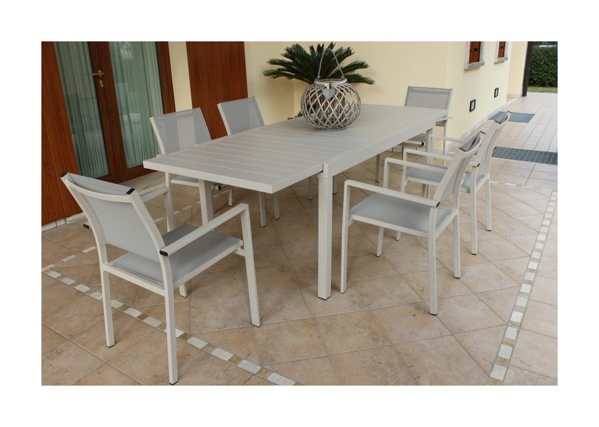 Vorreste invitare in giardino i vostri amici e dare loro il giusto comfort? Questo set è il complemento che fa per voi. La finitura e la scelta del bianco rendono il set neutro e ideale per qualsiasi ambiente esterno arredato con gusto moderno, garantendo al contempo stile e ricercatezza. Il tavolo da pranzo rettangolare da 200 cm allungabile fino a 300cm è realizzato in alluminio TORTORA con piano d'appoggio in alluminio tortora semi-opaco.