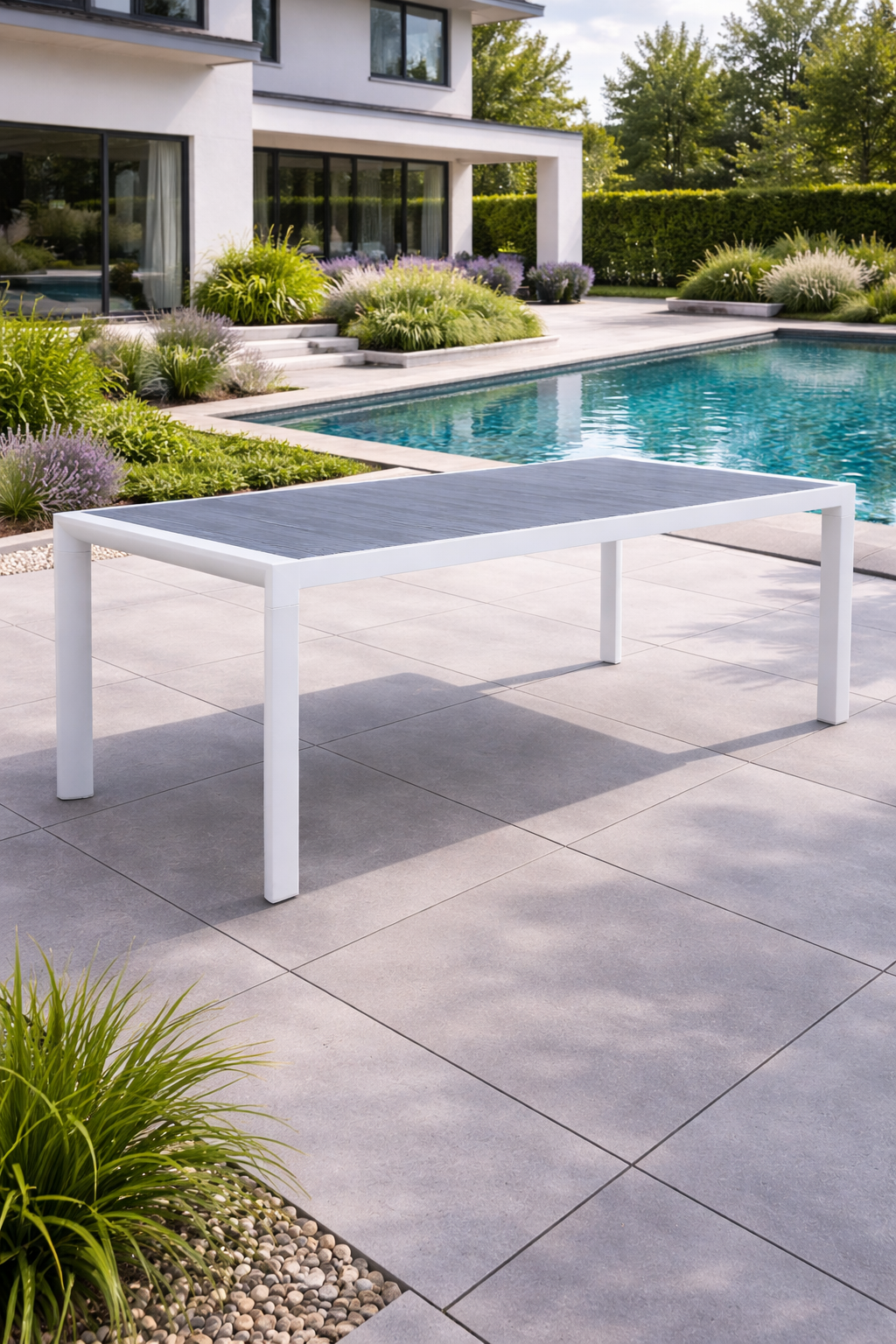 Presentato con struttura verniciata bianca e piano in gres porcellanato, questo tavolo moderno è ideale sia per l’arredo interno che per quello esterno.